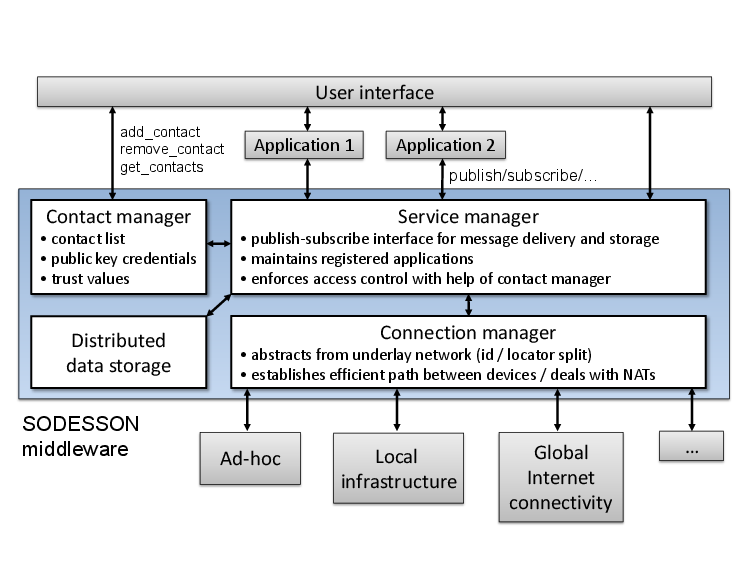 The architecture of the SODESSON middleware contains several functional building blocks and connects to user-centric networking applications by a unified publish/subscribe interface:
